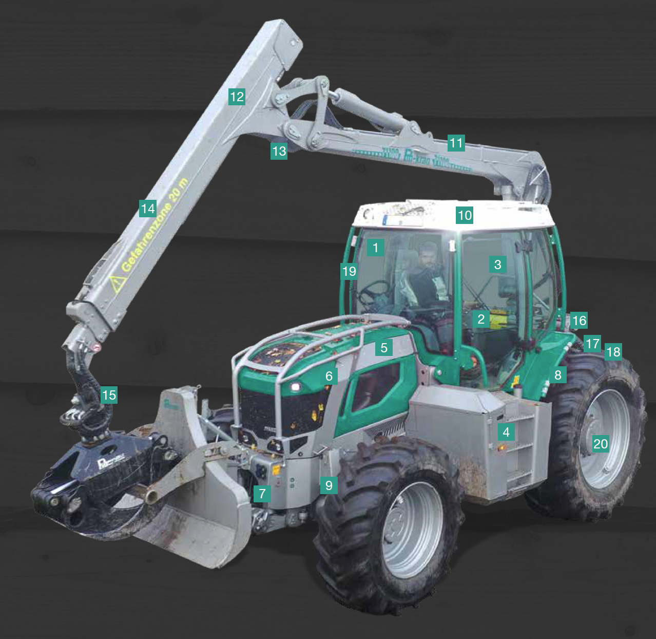 18. Fritt åtkomlig bakre kraftuttagsaxel, släpvagns skena, bakre hydraulik även med monterad kran (utan stångsskydd).